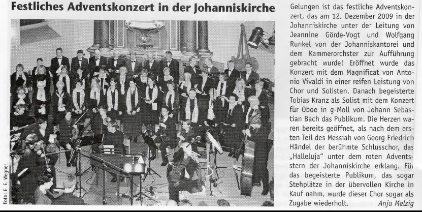 "Viva la Musica" Benefizkonzert zugunsten der Johannisorgel Programm (PDF-Datei) Adventskonzert in der Johanniskirche mit Werken von Bach, Schubert und Mozart Programm (PDF-Datei) |