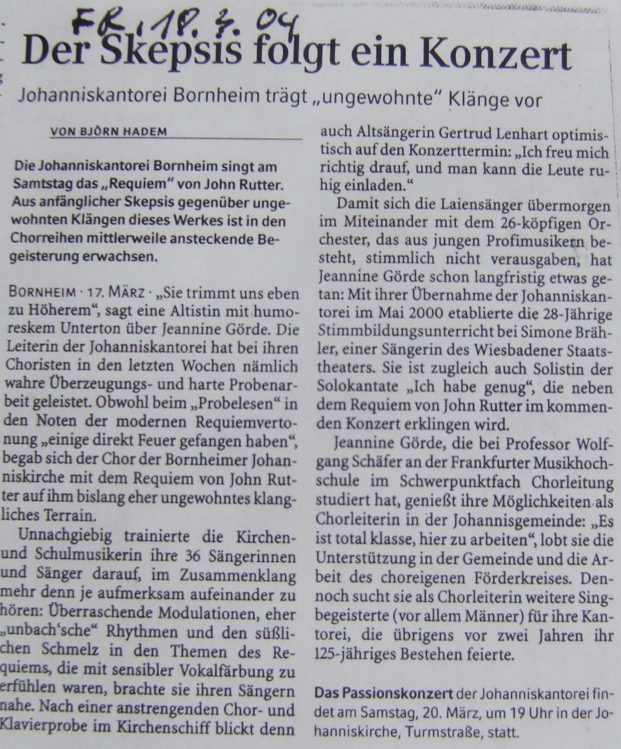 Passionskonzert mit Werken von Bach und Rutter. Programm (PDF-Datei), "Der Skepsis folgt ein Konzert", FR, 18.03.04 Passionskonzert der Johanniskantorei, Wir in Bornheim 02 / 04