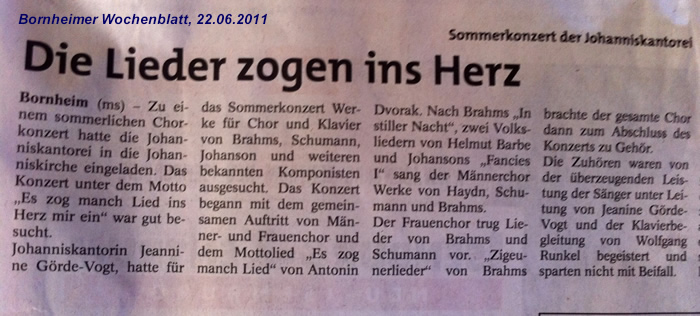 Sommerkonzert Plakat (PDF-Datei), Konzertprogramm (PDF-Datei) Die Lieder zogen ins Herz, Bornheimer Wochenblatt 22.06.2011